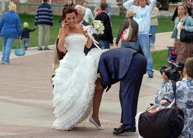 The groom in this picture clearly thinks that his wife has been on the phone with her mom for a little too long. He lost his patience and decided to go ahead and get under her wedding dress. The photographer in the bottom right hand corner saw his chance and was able to capture the racy moment. Get a room!