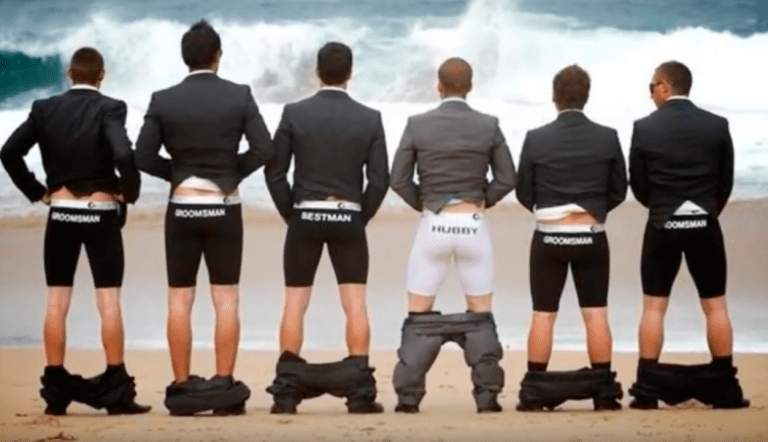 These ladies are celebrating the wedding on the clear, blue water at an exotic location. Apparently, it’s warm enough there to leave the dresses at home, because these bridesmaids weren’t wearing much more than they were born with on this special day. While we’re not too sure how the groomsmen were dressed, it’s clear that this was a fun party!