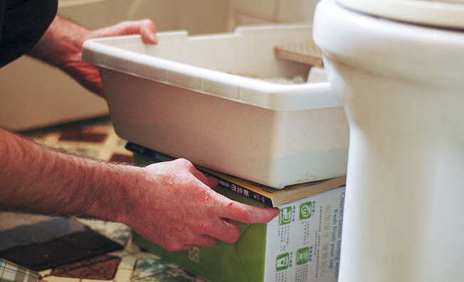 When the litter box is at the same height as the toilet, the next step is to move it 2.5 cm to the side every day, moving it onto the toilet seat. Repeat this step until the box completely covers the toilet. Also reduce the amount of litter you use every day until the layer is only 2.5 cm thick.