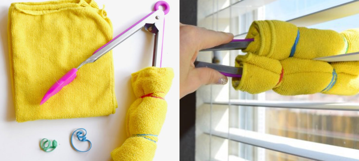Fold the microfiber cloths like you can see in the picture below. Fold them around the ends of the tongs and attach them with two elastic bands. Use the tongs to grip one of the slats of the blinds and move the tongs from one end to the other. You’ll see there’ll be loads of dust on the cloth when you’re done! You don’t need to moisten microfiber clothes, but if you want that extra fresh touch, you can spray a little bit of cleaning solution on it.
