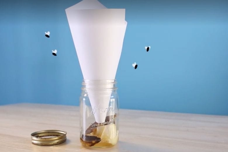 Place a bit of fruit in a glass and roll a piece of paper in the form of a cone as in the picture above. Place the narrowest part of the paper cone into the glass. The fruit flies will be able to fly down into the glass, but they won’t be able to get out again.