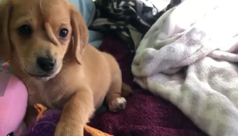 Abandoned puppy with tail on head saved from freezing cold