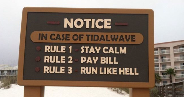 This restaurant cares for your safety, but they also want you to pay your bill. This funny sign gives you a 3-step-program to follow in case of a tidal wave. Because a wave isn’t going to pay the bills, of course. It makes us think… Just how often does this restaurant have to deal with tidal waves? When do you even think of putting up a sign like this?