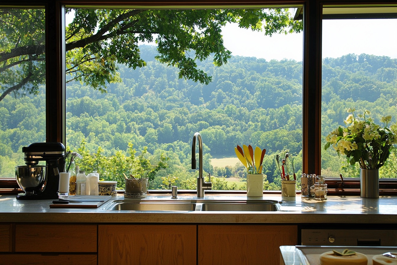 One of the home’s most remarkable features is the stunning panoramic view from every room. The windows overlook miles of forested hills and valleys, creating a sense of connection to the natural world outside. On clear days, you can see for miles, but the home retains its secretive feel, hidden away from the eyes of passersby.