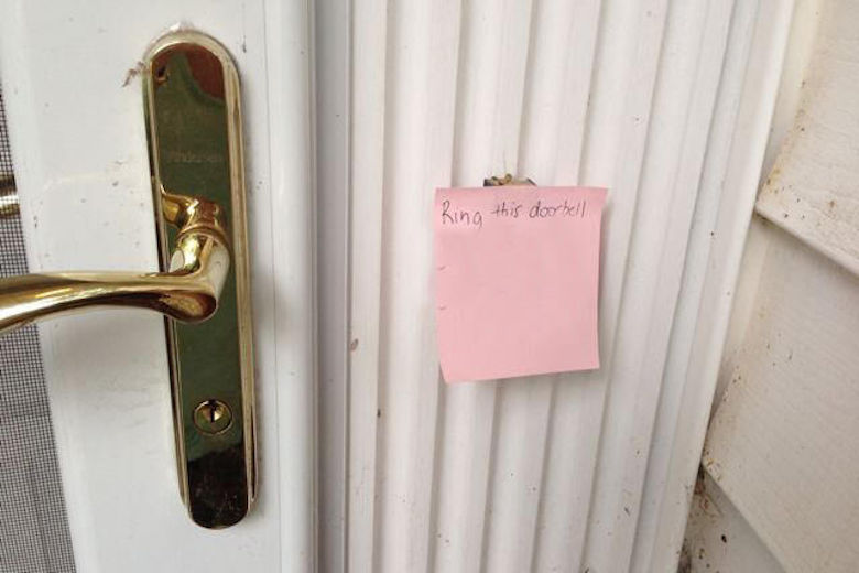 The doorbell had been pulled out of the wall as if someone had tried to break in. Not a good sign. At first, Thomas immediately wanted to call the police but decided to just follow the instructions on the letter and rang the bell. This led to a deafening sound.