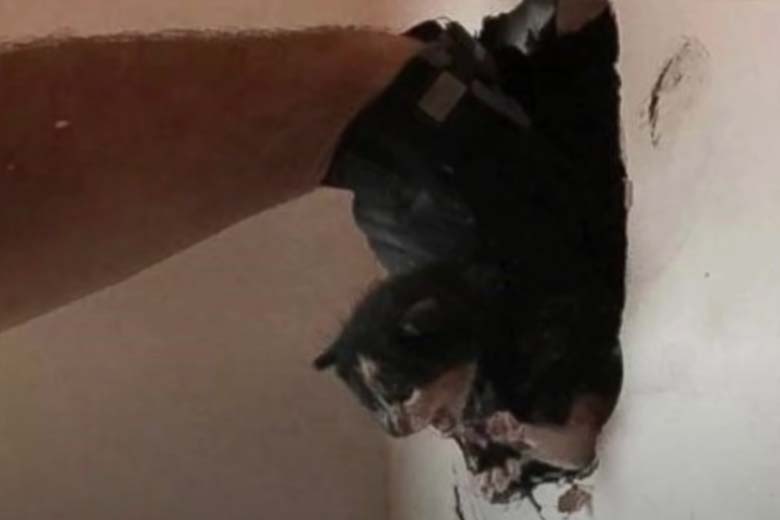 Turns out there was a little kitten hiding in the hole behind the paneling! The poor creature had been trapped there for at least five days since that’s how long Crosby had been trying to draw his owner’s attention to the hole. George noticed that the little kitten looked a lot like the neighbor’s dead cat. Super coincidental!