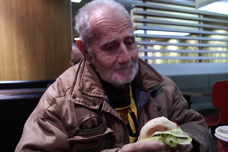 Homeless man reveals his true identity and shocks waitress who brings him food