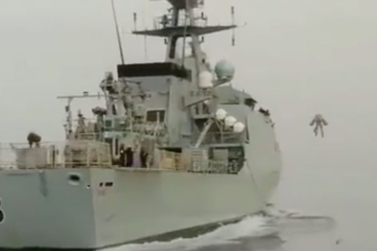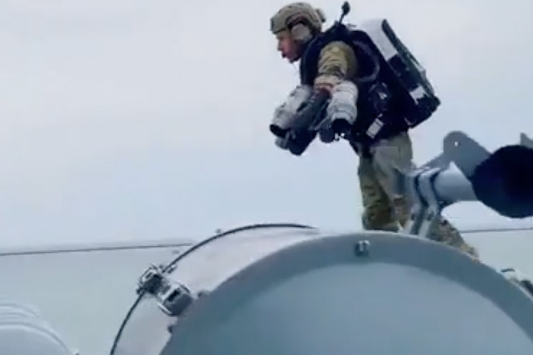 The flying figure that had approached the pirate ship was one of the most modern pieces of military equipment in use. It was a soldier with a jetpack, who was able to board the fast-moving ship by flying towards them. The pirates were completely unprepared for this. The future is now!