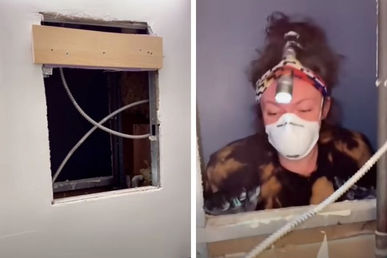Once the source of the draft was found, Samantha decided to remove the mirror from the wall. Not an easy job, but it soon became clear why there was a lot of cold air in the bathroom. Samantha explains: “I realized then that the mirror wasn’t attached to the wall, which is kind of strange. But hey, that’s how they hang mirrors sometimes. Still, the cold air was a bit suspicious.”