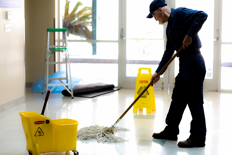 The old man struggled to get down to his knees. But he had been hired to do a job and the trash that was now on the floor needed to be cleaned up. Luckily for him, another office worker had been close and rushed to his aid. He picked up the trash can and refilled it with its spilled contents.