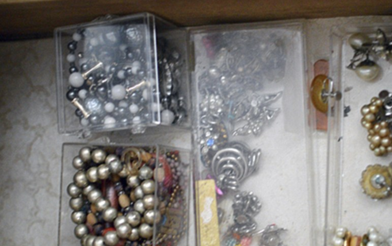 13. The dressing table in the bathroom displayed outdated toiletries. Inside the drawers, a box stuffed with hats, jewelry and photo albums was found.