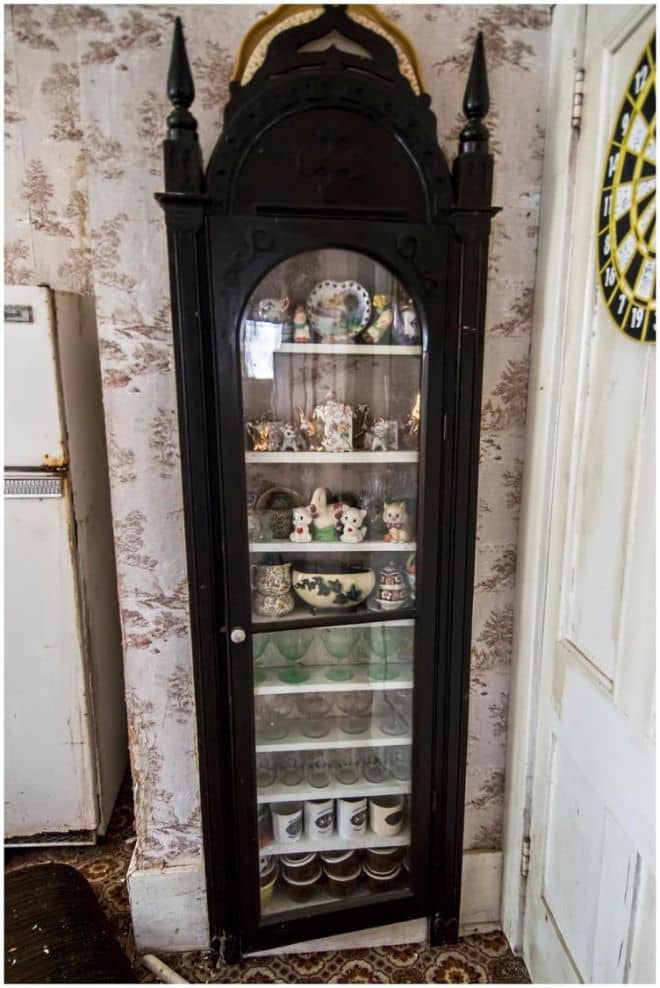 8. The display cabinet accommodates little china cats, glasses, and floral teacups.