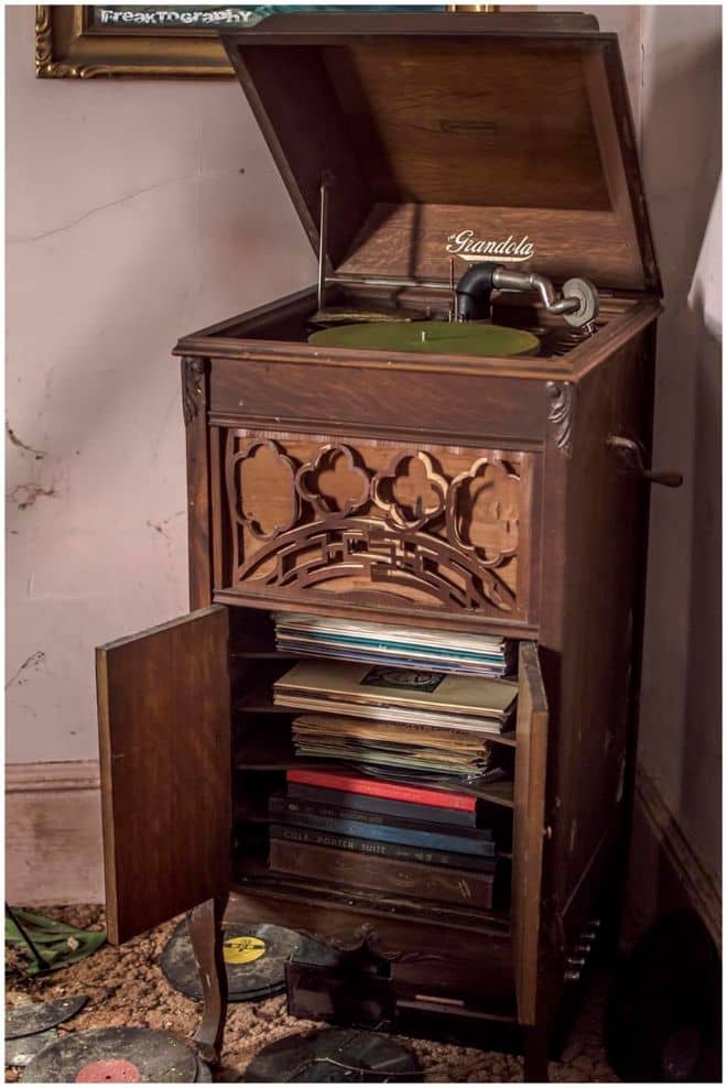 9. This room had decayed the worst. It features a red couch, two plush chairs as well as other pieces of furniture. An acoustic guitar remains in its case on the coffee table, together with an old record player and a stack of vinyl records.