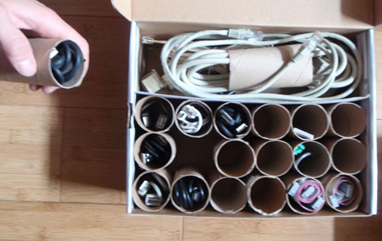 Most households have a cable box. That one box that is stuffed to the brim with “might-need-this-later” cables. But when you actually need one of them and take it out, it’s probably tied and knotted to about six other cables. Talk about a hassle. Next time you run out of toilet paper, use the leftover roll to organize your cable box!