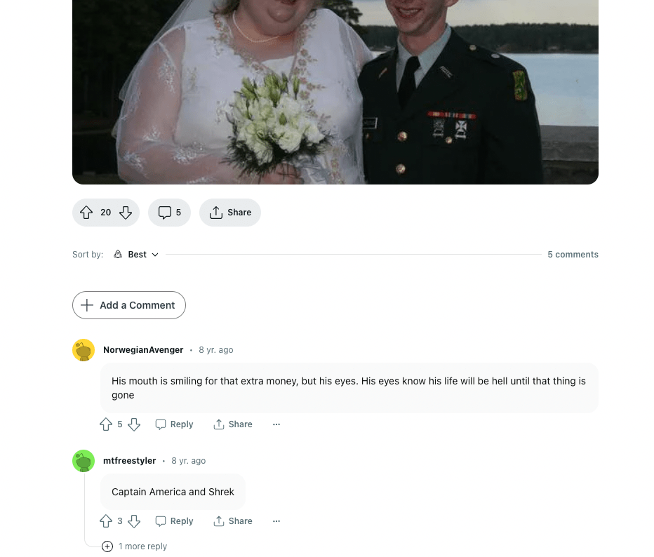 On Reddit, numerous discussions emerged where individuals made disparaging remarks about the newlywed couple, particularly targeting Maria. Comments such as “Did she eat her hairline, too?” and comparisons like “Captain America and Shrek” inundated the internet. This was extremely challenging for the couple.