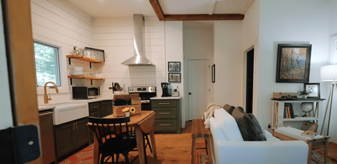 As an 29 year old woman, this tiny house is the perfect size for her needs. It’s just enough space to have all the amenities she needs, including a comfortable couch to curl up on with a blanket and a warm, wood paneled interior that feels like a mountain retreat.