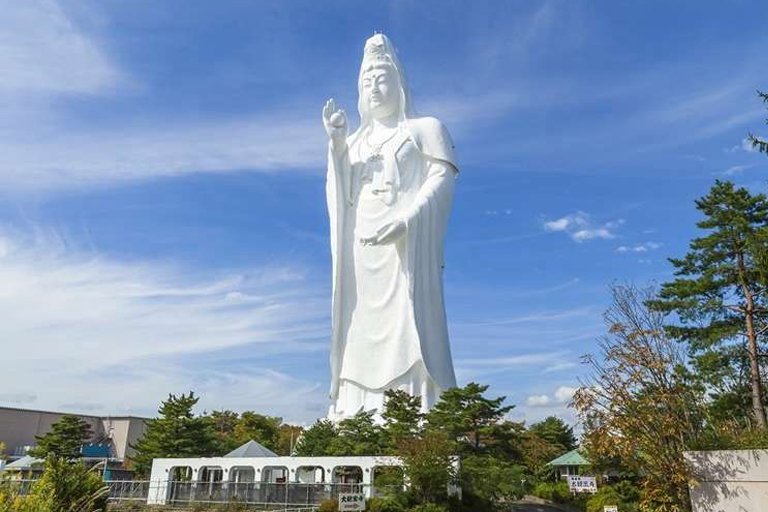 Sendai Daikonnen, officially known as Sendai Tendou Byakue Daikonnen is an enormous statue depicting Byakue Kannon, a figure from Buddhist lore. She holds a cintamani gem in her hand. This gem is said to be the Eastern equivalent of the philosopher’s stone.