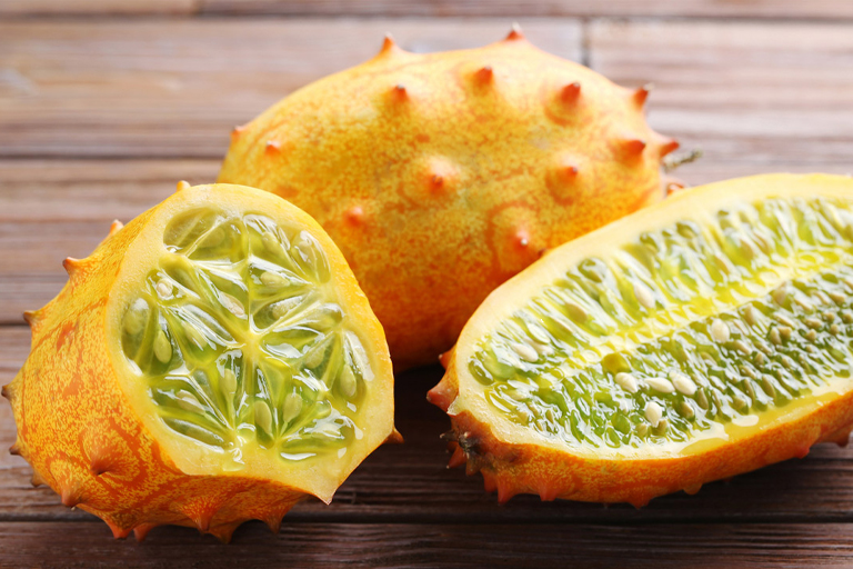 This unusual fruit has spiny horns on its green, yellow or orange skin. When the skin ahs turned a bright deep orange, it is ready to eat. The pulp inside the fruit, which looks a bit like green Jell-O, tastes unlike any other fruit. It is described as “sweet-sour, banana-lime, tropical fruit tasting”.