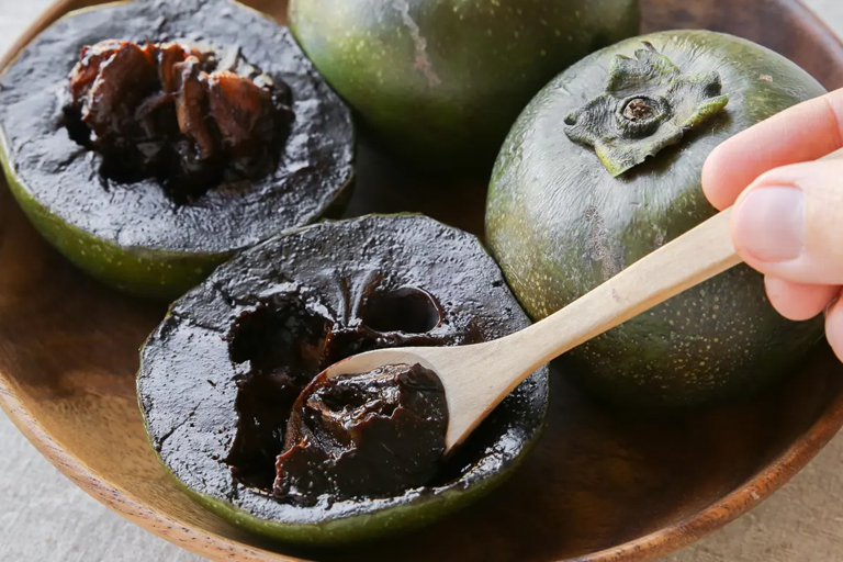 This fruit is called the black sapote, or “chocolate pudding fruit”. Its taste is unlike any other fruit in the world, containing delightful tones of honey, caramel and dates. The best time to eat this fruit is when the outer appearance looks like its past its prime and bruised. The texture of a perfectly ripe black sapote is creamy and mushy.