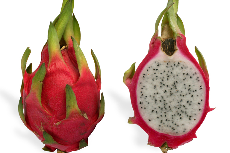 Dragon fruit or pity is a fruit of several different cactus species that were originally only found in the America’s. Nowadays, the fruits are cultivated all over the world. When ripe, the flavor of a dragon fruit is described as a mildly sweet blend of pear and kiwi. Under-ripe dragon fruit has barely any flavor.