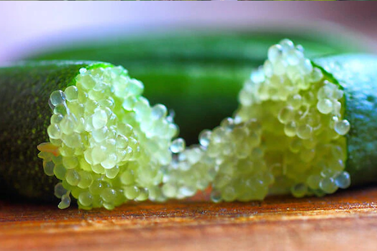 This unique fruit is native to the eastern coastal rain forest of Australia. When the outer peel is cut in half, the pearlescent juice vesicles stream out like an eruption. The finger lime’s vesicles are round and resemble caviar. The flavor of these vesicles is reminiscent of very intense lemon or limes, with herbal notes. You can squeeze the fruit onto your tongue and enjoy the flavor of this incredible fruit.