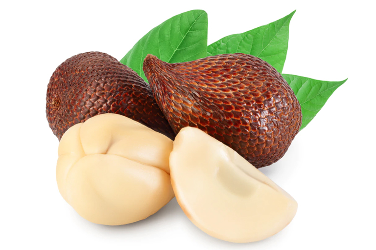 This Indonesian fruit has a very distinct appearance. Its outside is prickly like a cactus and, most notably, covered in what appears to be snakeskin. The fruit is about the size of a fig and grows in clusters of fifteen to forty fruits. Its edible inside has the texture of a garlic clove and tastes a bit like a crunchy pineapple.