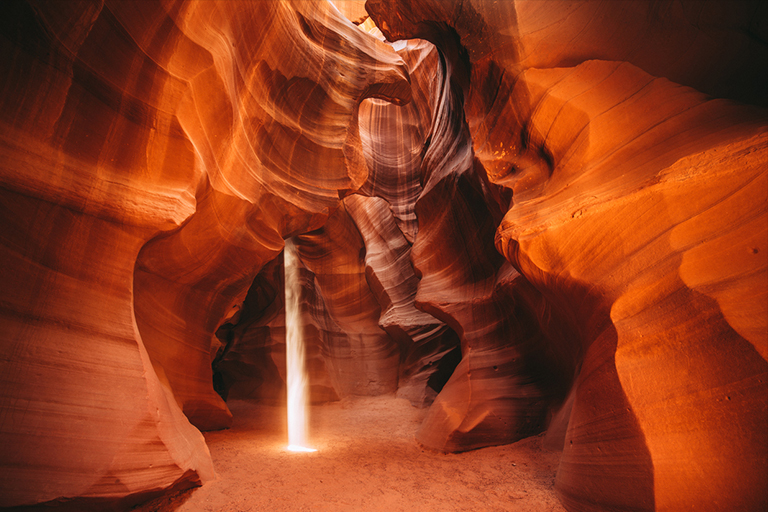 Antelope Canyon is a slot canyon on Navajo (a Native American tribe) land in Arizona. The Navajo name for the canyon is Tsé bighánílíní, which means the place where water runs through the rocks. It was formed by the erosion of sandstone, due to flash flooding. Over time the water smoothed away all the hard edges and the characteristic “flowing” shapes were created.