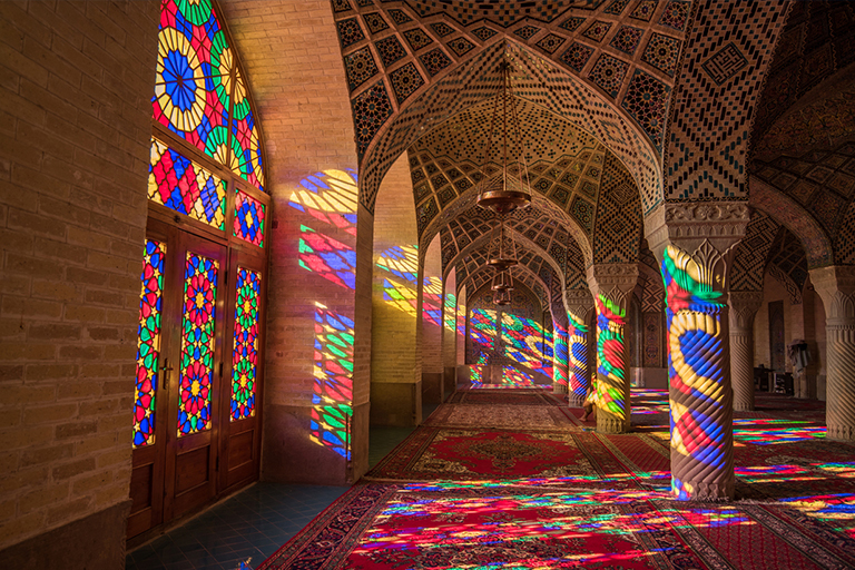 This mosque in Iran, which is also known as the Pink Mosque, is famous for its extensive colored decorational glass. Light is an important part of many mosques, because it is a major symbol for God in Islam. The stained glass windows of the mosque create a tapestry of beautiful colors on the floor of the prayer hall.