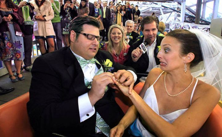 Oof, the facial expression of the bride shows that she is having some serious second thoughts. While the groom is concentrated on getting the ring on and sealing the deal, the bride looks like she’s ready to pull her hand back and dash for the nearest exit.