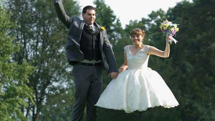 Wait… Did he just marry a woman without any legs? And if so, how is she staying upright? Surprise! It’s actually an optical illusion. The bride is jumping in the air and has her legs bent. The length of her dress covers her knees, so that it looks like she’s floating.