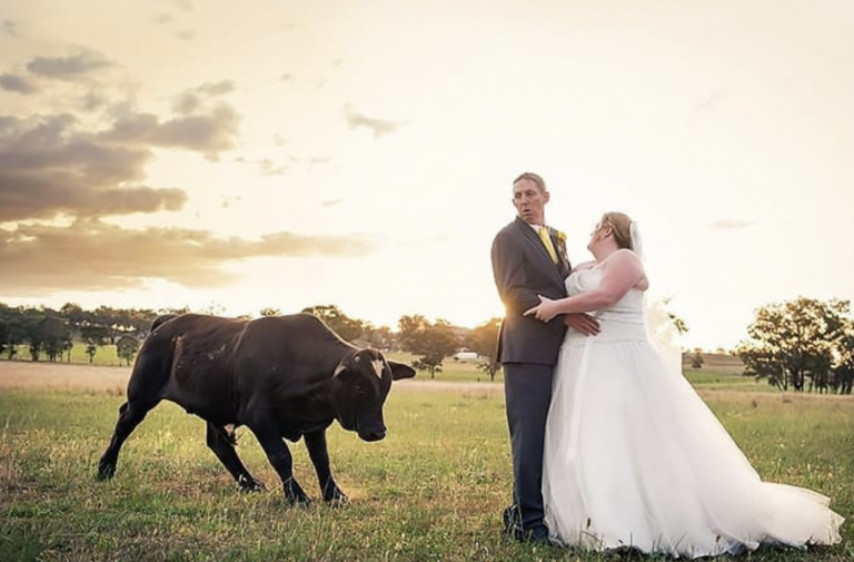 This bull is about to show the groom who’s the real man around these parts. The couple hadn’t paid enough attention to their surroundings while posing for their wedding photos. If they had, they would’ve been able to see this coming and they could’ve chosen a better spot for a photoshoot.