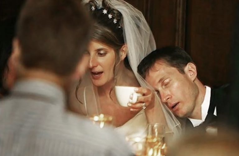 This groom apparently didn’t even make it to the coffee round. While his wife is holding a cup of coffee, he has already dozed off. Oof, that must’ve been a very exhausting wedding. We hope it’s just the exhaustion and not an excess of drinks, because weddings are supposed to be a day to remember.