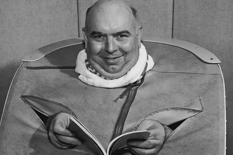 This weird invention is called the sauna tub. In the 1950s, it was all the rage. You enter the sauna tub and zip it up, leaving your head (and optionally, your hands) exposed. You then enjoy your private sauna and all the health benefits that come with it. It was also said to melt fat.