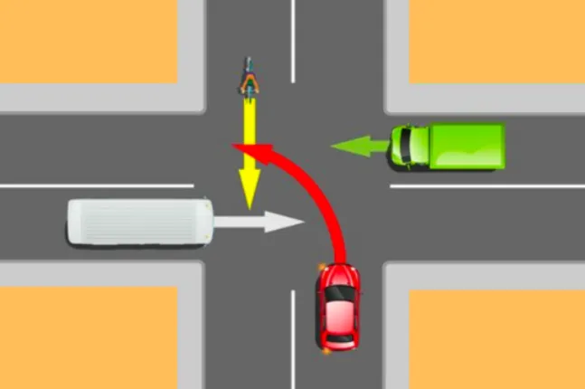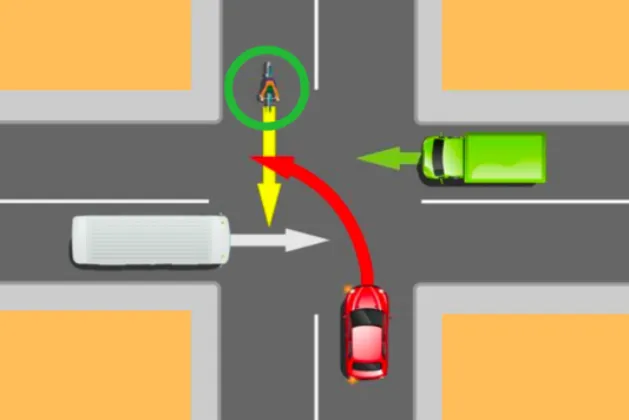- Consequently, the red car, wanting to make a left turn, would typically yield to oncoming traffic, including the motorcyclist, green truck, and white bus. It is customary for left-turning vehicles to yield to all oncoming traffic to ensure a safe flow of vehicles through the intersection.