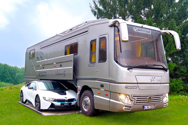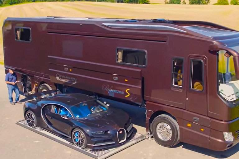 This mobile home comes with a hefty price tag. It costs 1.42 million euros. For that amount of money, you get a mobile home that is around 12 meters long and weighs around 18 tonnes. It comes with a built-in garage to store your car in and it contains all the newest technology.