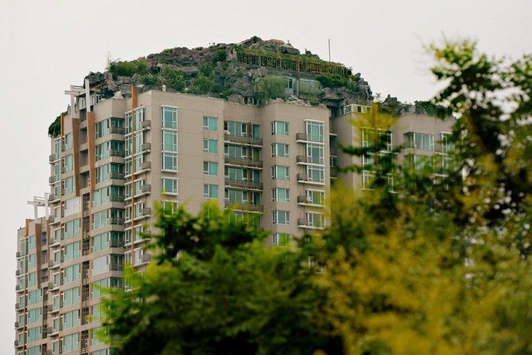 This millionaire from Beijing, Zhang Biqing, was already the owner of a 26-story building. But that wasn’t enough: he decided to build a private mountain on top of it. It has everything you’d expect from a Chinese mountain: trees, rocks, grass, pathways, benches to sit on and a lot more.