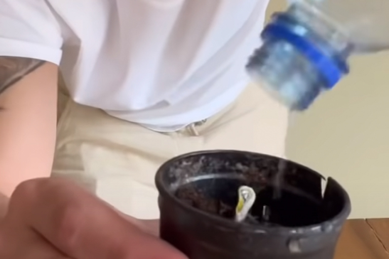 Grab a small pot of soil and plant the seed tail-down. Grab a bottle of water and water the seed, getting the soil nice and moist. Now you’ll want to do something strange: cut off the top of the water bottle and use it to cover the seed. Why?