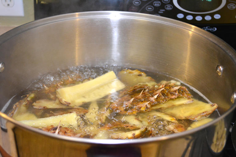 Grab a pot and fill it with water. Take the pineapple peels and add them to the water. Next, you’ll want to bring the water to a boil. This should only take a few minutes. Once the water is boiling, you’re ready for the next step.
