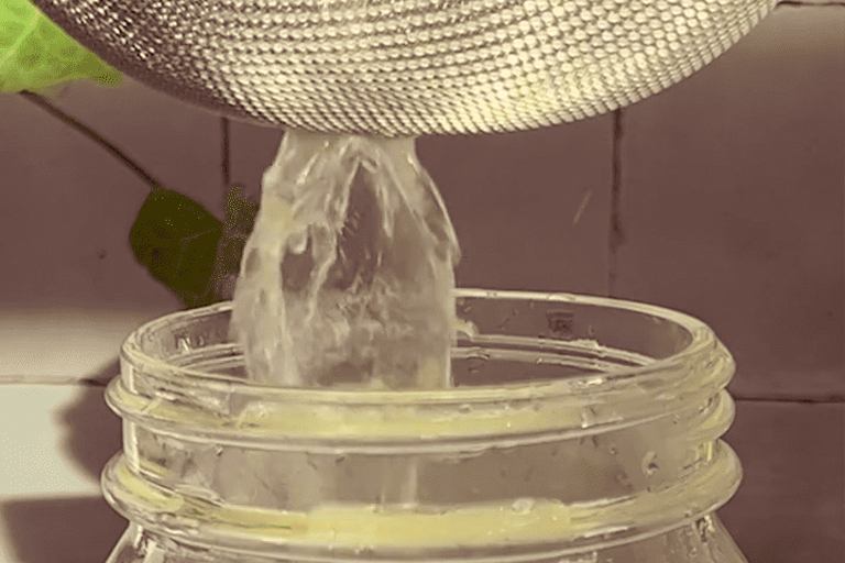 What happens during the simmering process is that the powerful nutrients inside the inedible pineapple peels are being transferred over into the water. Next, you’re going to need a strainer. Place it on top of a container and pour the contents of the pan into it, straining the liquid out.
