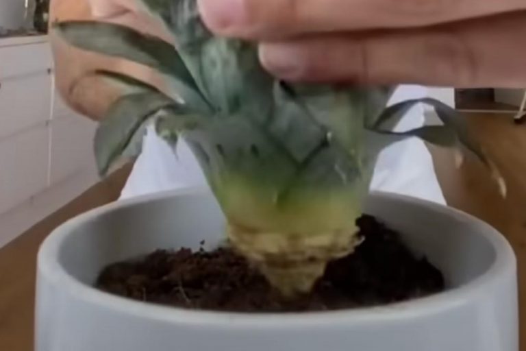 Next, you grab a pot with soil and plant the top of the pineapple. You can do this easily by twisting the top into the ground, as you would with a screw. Please do this gently. The next step is to water your new plant from the top, every 4-5 days.