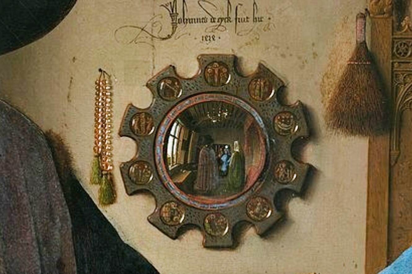 The mirror in the portrait shows the back of the two main protagonists in the painting, but also a person in the middle. It has been speculated that the figure in the middle is Jan van Eyck himself, the artist who painted the portrait. This self-portrait hidden in the mirror is a common practice among Renaissance artists.