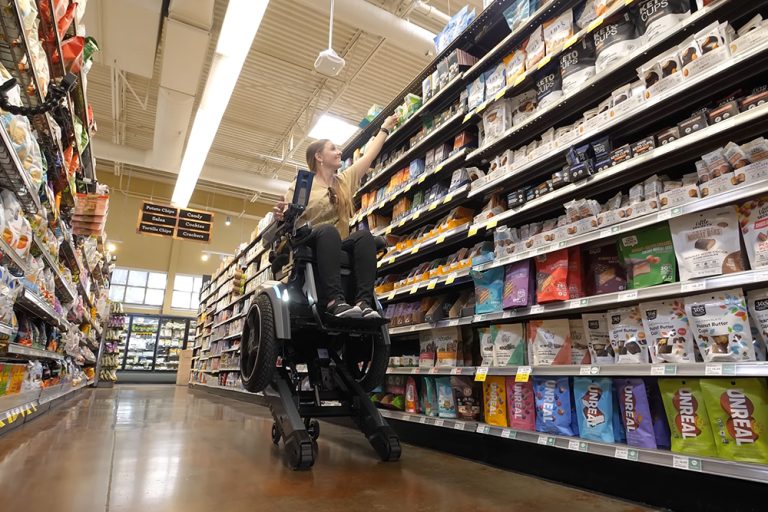 You can even raise or lower the wheelchair! This allows the person in it to be able to climb out, into a manual wheelchair, in a safe manner. It also makes grocery shopping a lot easier, as you can see in the picture above. You can simply raise the seat of the wheelchair up into the sky, so that you can reach the top shelf. No need to ask anyone ever again!