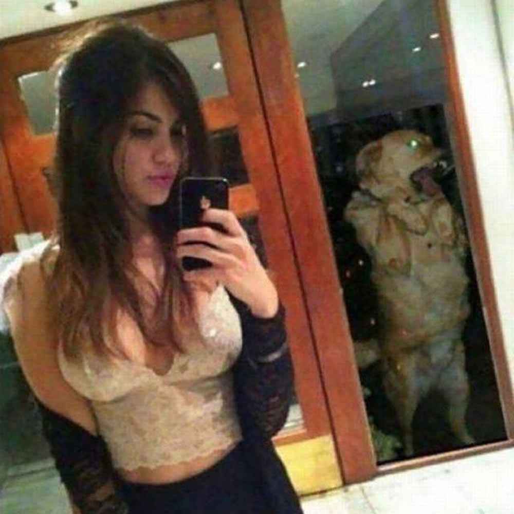 Outside the window, a dog is smashing his face against the glass, mouth agape in a weird and wild way. We can’t help but laugh at the timing of this dog’s funny face perfectly positioned right above his owner’s shoulder. It’s as if he deliberately wanted to ruin yet another one of her glam shots!