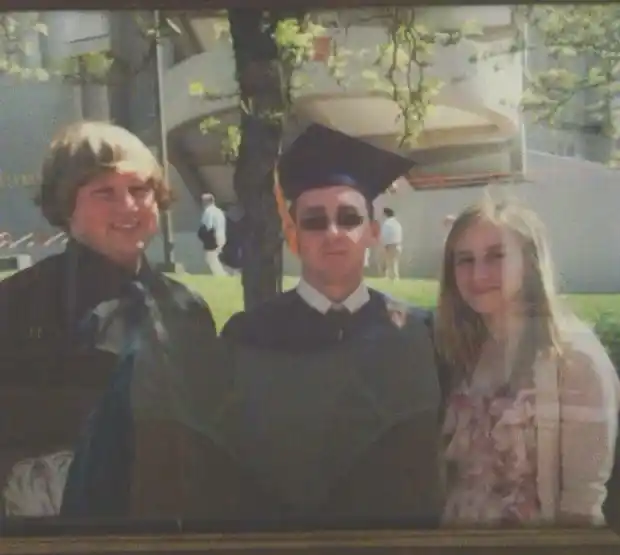 At first glance, this photo appears to be a typical graduation portrait of a proud graduate posing with his friends, ready to embark on the next chapter of his life. But take a closer look at the background, and you’ll spot something that’s far from appropriate for such a dignified ceremony snapshot.