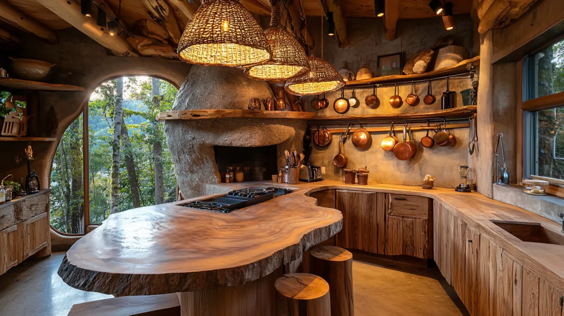 At the heart of the kitchen is a central island crafted from a thick wooden slab, serving as both a workspace and a casual dining area. Surrounding the island are simple wooden stools, their rustic design adding to the room’s organic aesthetic. A stone fireplace in one corner not only serves as a functional feature but also adds a sense of comfort and tradition. Above the island hangs a rack of copper pots, their warm tones complementing the natural materials throughout the space. The kitchen’s cozy and grounded feel makes it the perfect spot for sharing meals and stories.