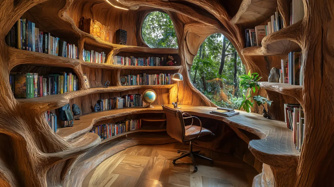 The cozy study in the Tiger Forest Home is a perfect space for reflection, creativity, or quiet reading. Built into the tiger’s structure, the room is lined with built-in bookshelves carved to resemble tree branches, giving the space a whimsical and organic feel. A central reading nook with a cushioned seat is tucked into an alcove, surrounded by shelves filled with books and small decorative items.