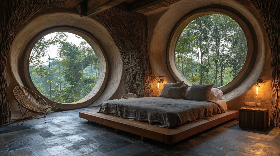 The master bedroom of the Tiger Forest Home is a serene haven located behind the tiger’s eyes, which are designed as large circular windows overlooking the forest canopy. These windows bathe the room in natural light, creating a tranquil ambiance that feels deeply connected to the surrounding environment. A low platform bed made of reclaimed wood is positioned to face the windows, allowing the forest views to take center stage.
