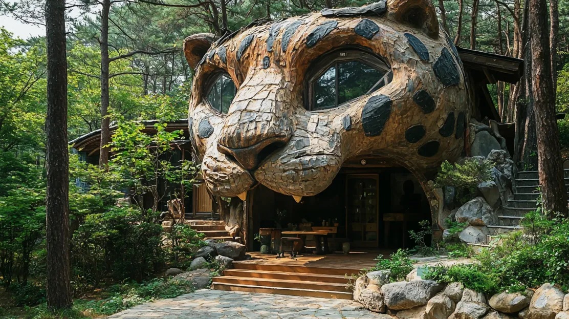 The tiger, often referred to as a guardian of the mountains and a protector against evil spirits, inspired the home’s unique design. The exterior immediately captures attention, with its massive tiger-shaped façade carved from wood and stone. The structure’s head forms the core of the house, with its eyes doubling as massive windows that peer into the surrounding forest canopy. Constructed using locally sourced materials, the home represents harmony with its environment, celebrating both traditional Korean craftsmanship and modern architectural ingenuity. The decision to shape the home like a tiger was not merely aesthetic but deeply rooted in Korean mythology, where the tiger symbolizes power, courage, and protection—qualities the designers hoped to imbue in this serene forest retreat.