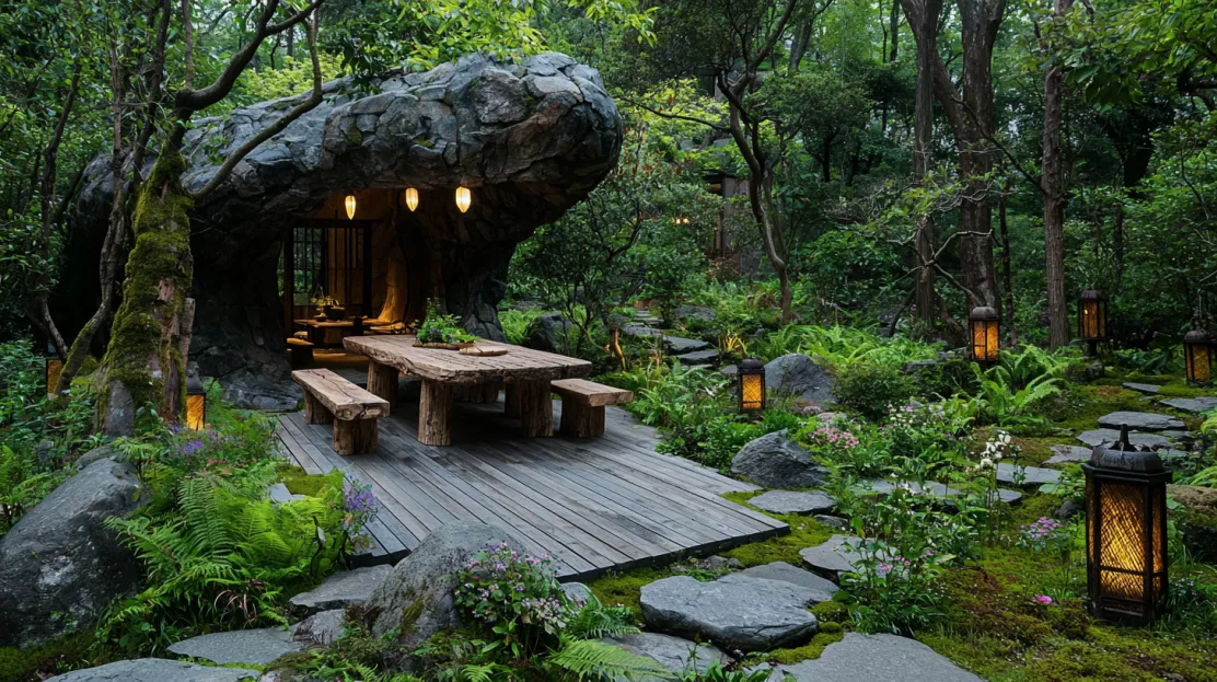 Natural stone steps lead from the patio to the forest floor, creating a seamless transition between the house and its surroundings. Potted plants and small rock arrangements enhance the space’s organic feel, while the dappled light filtering through the trees adds an ever-changing play of shadows. Whether enjoying a morning coffee or an evening under the stars, the patio is a space that embodies the harmony and tranquility of the Tiger Forest Home.