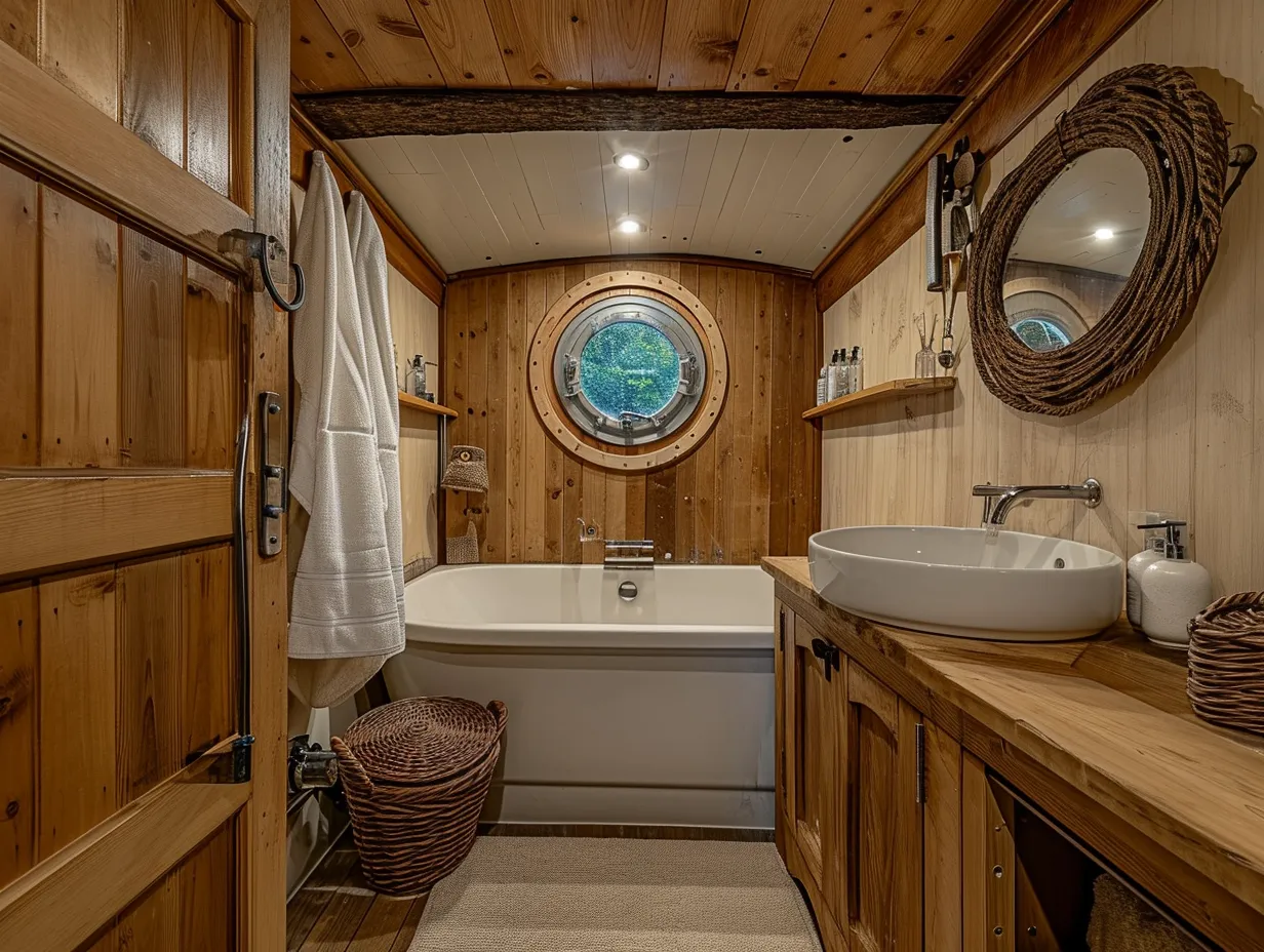 But the showstopper? A hidden gem behind a quaint wooden door in the bathroom: a luxurious, oversized bathtub. It’s not just a bath; it’s an escape into a personal spa. Above it, a strategically placed window ushers in natural light or a dance of starlight, setting the stage for a serene soak.